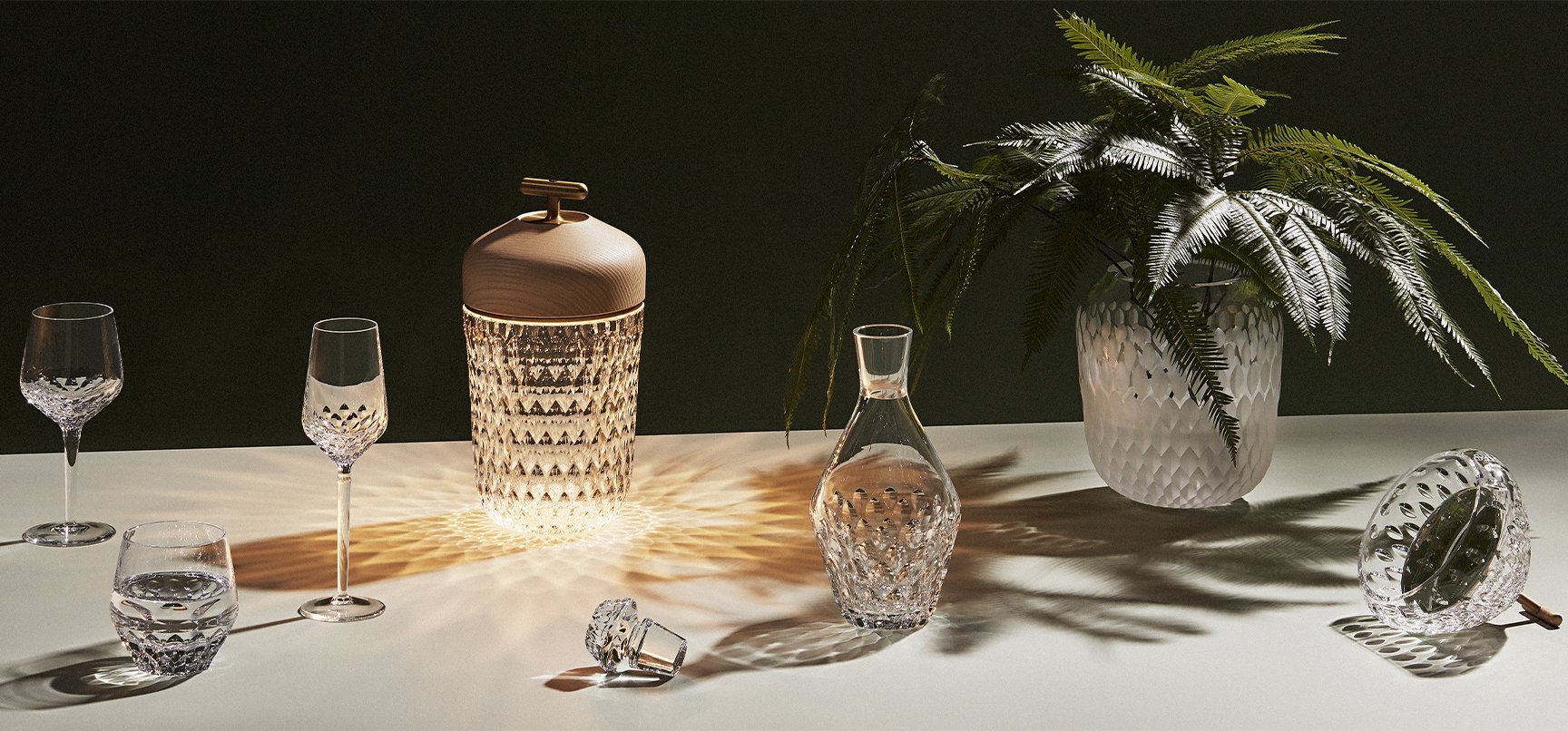 〈フォリア〉コレクションは、照明、小さな家具、装飾品、食器など、あらゆるタイプのオブジェを含む幅広いコレクションです。ラウンドシェイプと多彩なカットで、クリスタルの輝きを幾何学的かつ有機的なフォルムを表現しています。ノエ・デュショフール=ローランスは、クリスタルを手作業でカットするコールドワークを施したこのモチーフをデザインするために、工房を囲むモーゼルの森の葉からインスピレーションを得たと言います。彼は工房の職人たちの職人技を頼りに、このコレクションの全てにホットワークの成形時技術と、コールドワークの装飾技術とを余すところなく取り入れました。この工房を象徴するこれら2つの技法は、ユネスコの無形文化遺産に登録されています。